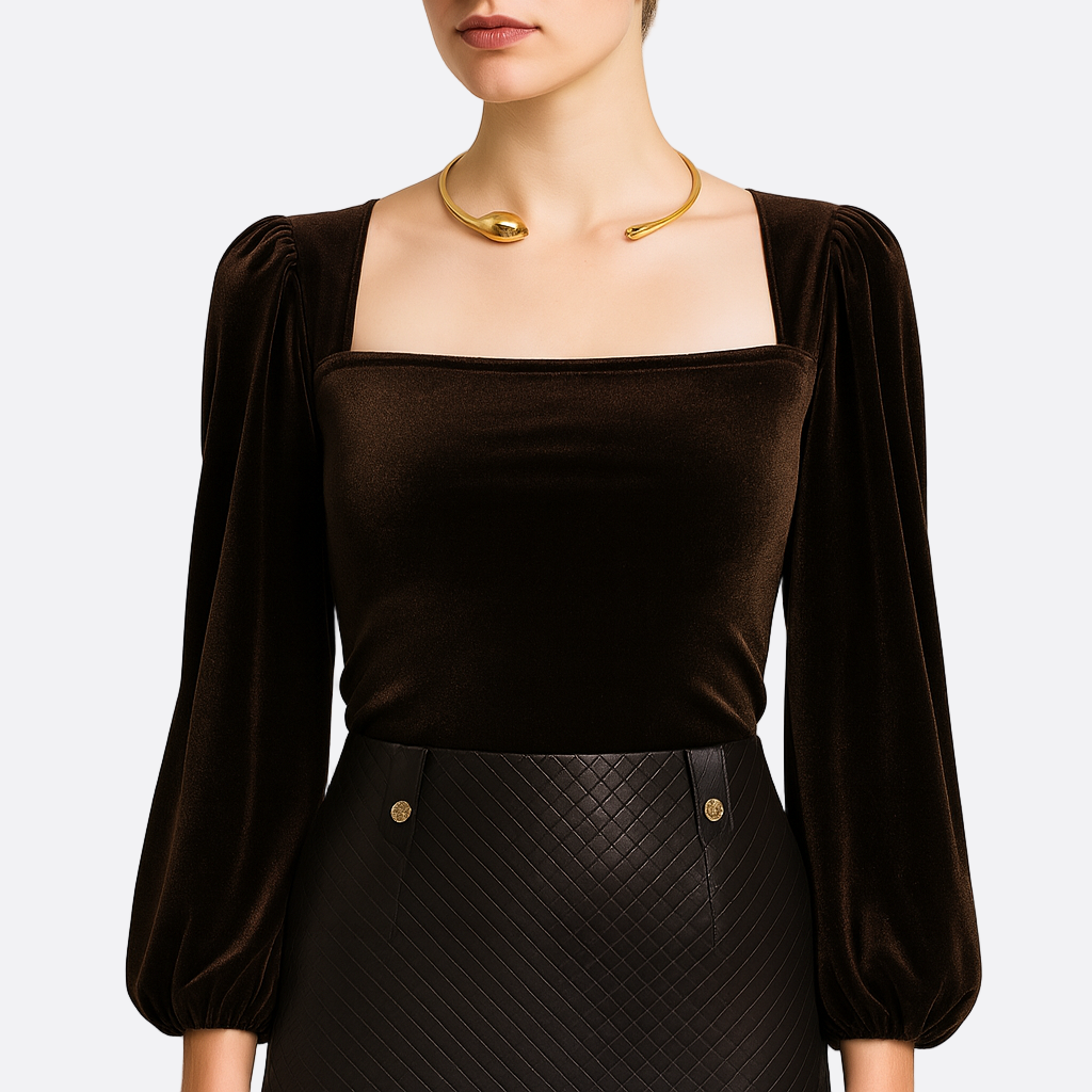 Damska -Aksamitna bluzka - Dekolt kwadratowy - Bufiasty rękaw - Modny wybór na każdą okazję