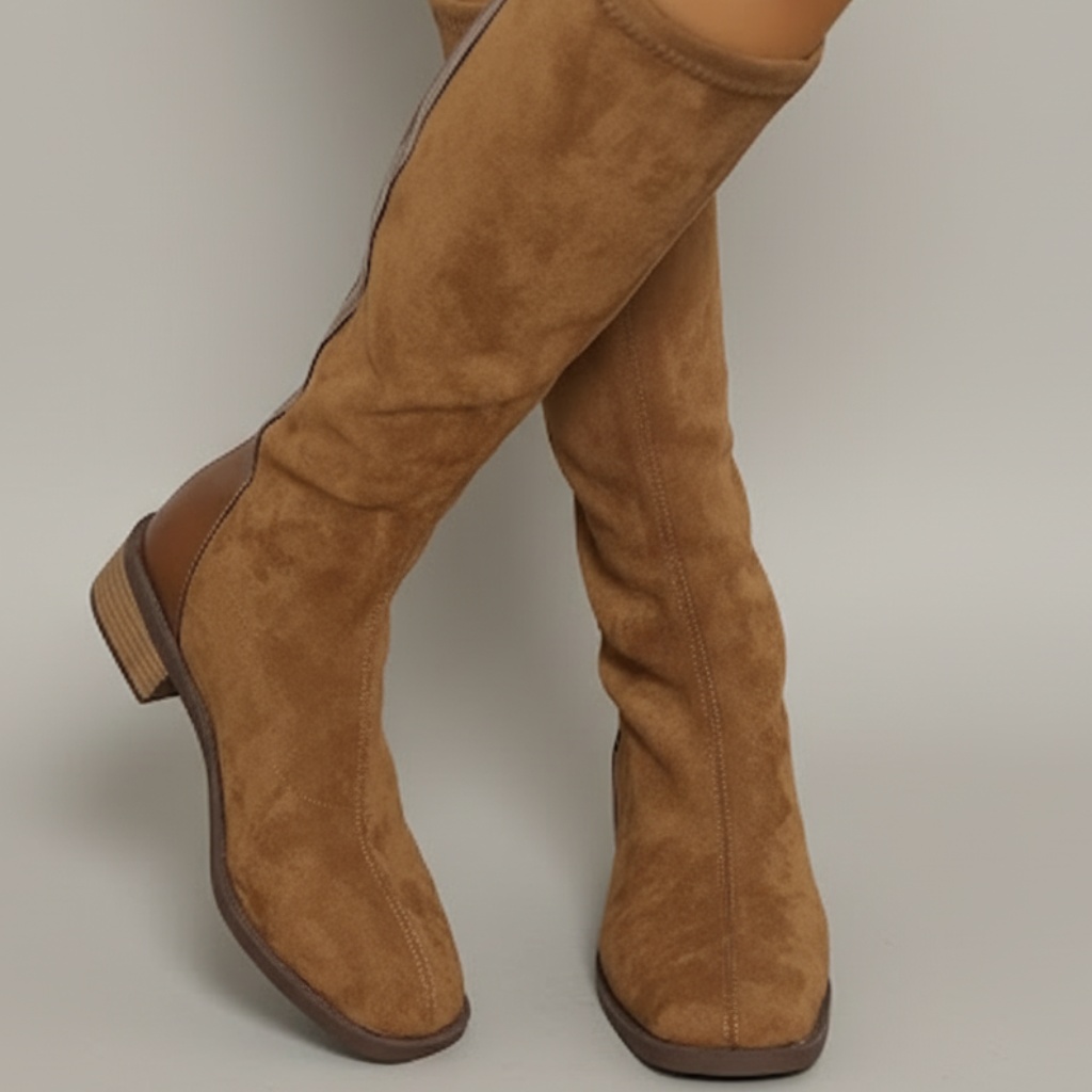 Te damskie klasyczne zamszowe kozaki za kolano łączą elegancję z komfortem. Wykonane z miękkiego zamszu i wyposażone w blokowy obcas, zapewniają wygodę przez cały dzień. Ich stylowa sylwetka doskonale pasuje do sukienek, spódnic i spodni, co czyni je idealnym wyborem na sezon jesienno-zimowy. Dzięki wygodnemu bocznemu zamkowi błyskawicznemu, te wszechstronne kozaki są łatwe w zakładaniu i stanowią niezbędny element każdej garderoby.