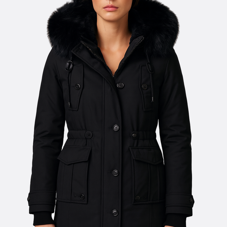 Damska - Dopasowany płaszcz średniej długości - Kaptur ze sztucznego futra - Elegancki i ciepły płaszcz na każdą okazję