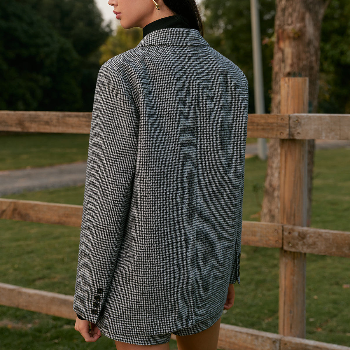 Damska - Dwurzędowy blezer tweedowy w pepitkę - Elegancki styl - Idealny na każdą okazję