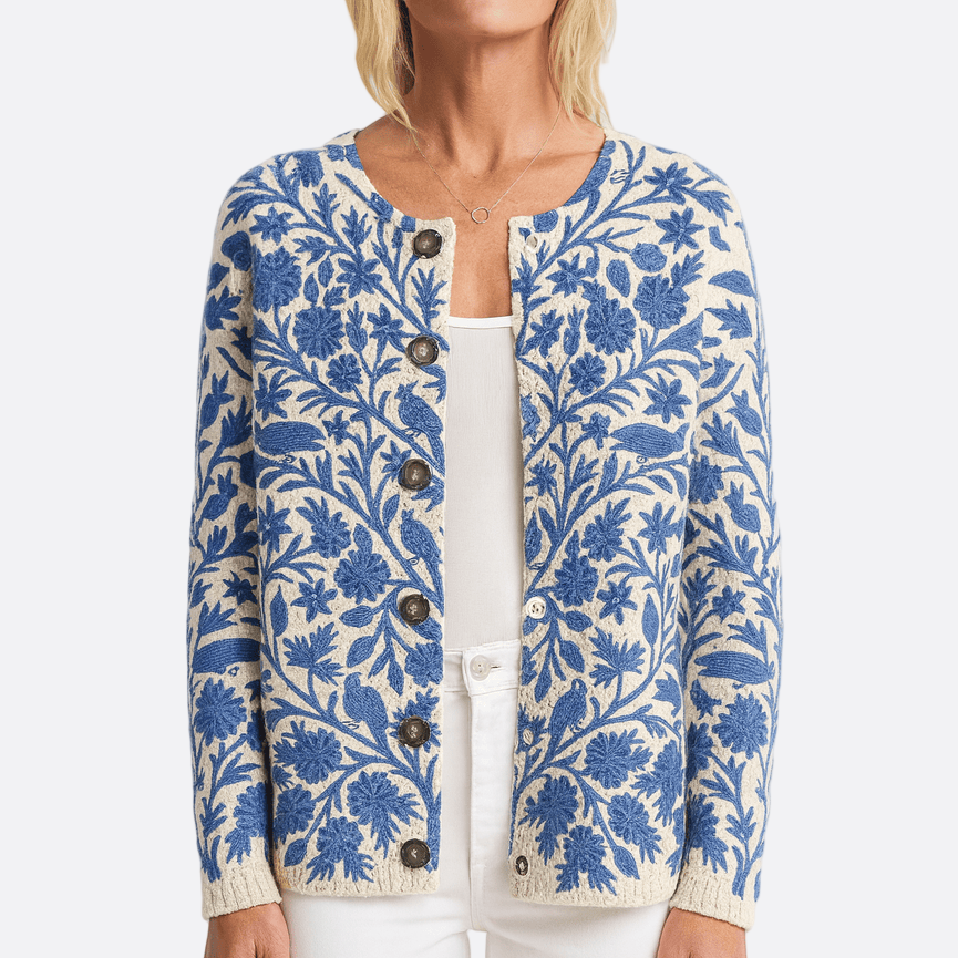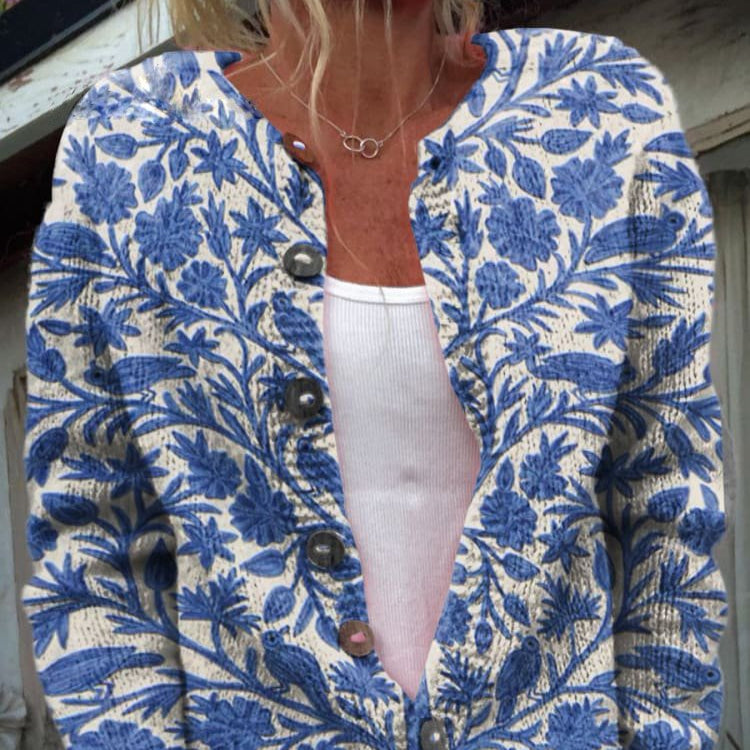 Damska - Kardigan - Dzianina w kwiaty - Dekolt w serek - Modny styl na każdą okazję