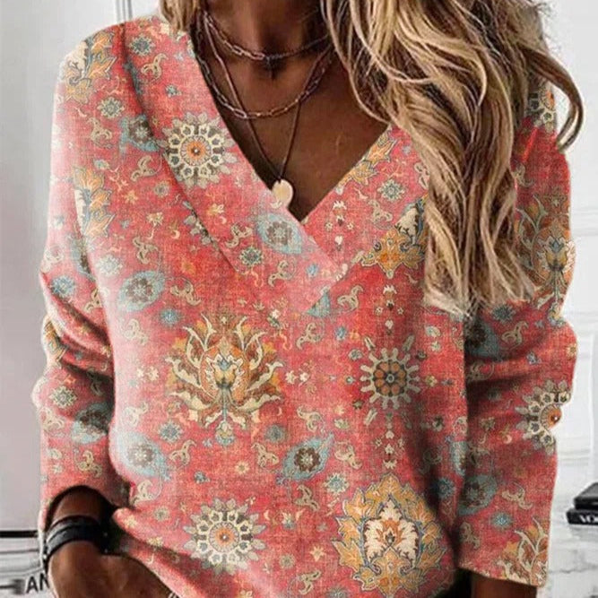 Damska - Luźna bawełniana bluza - Dekoltem w serek - Komfortowy i stylowy wybór na co dzień