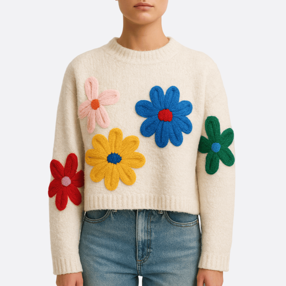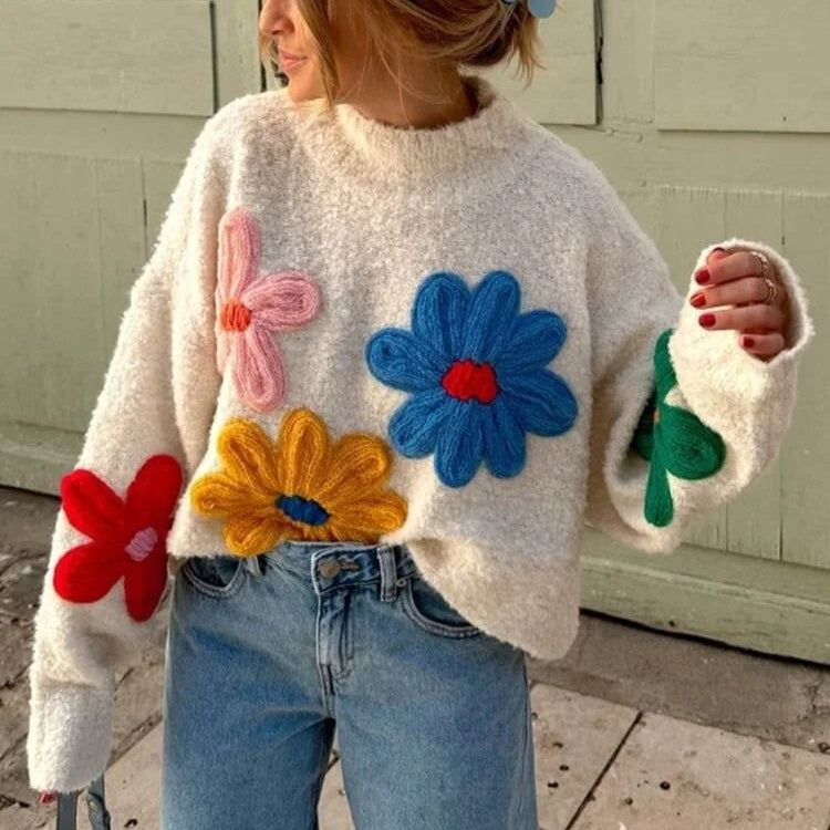 Damska - Oversizowy sweter - Grubej dzianiny - Biały z kwiatowym wzorem - Modny i komfortowy na co dzień