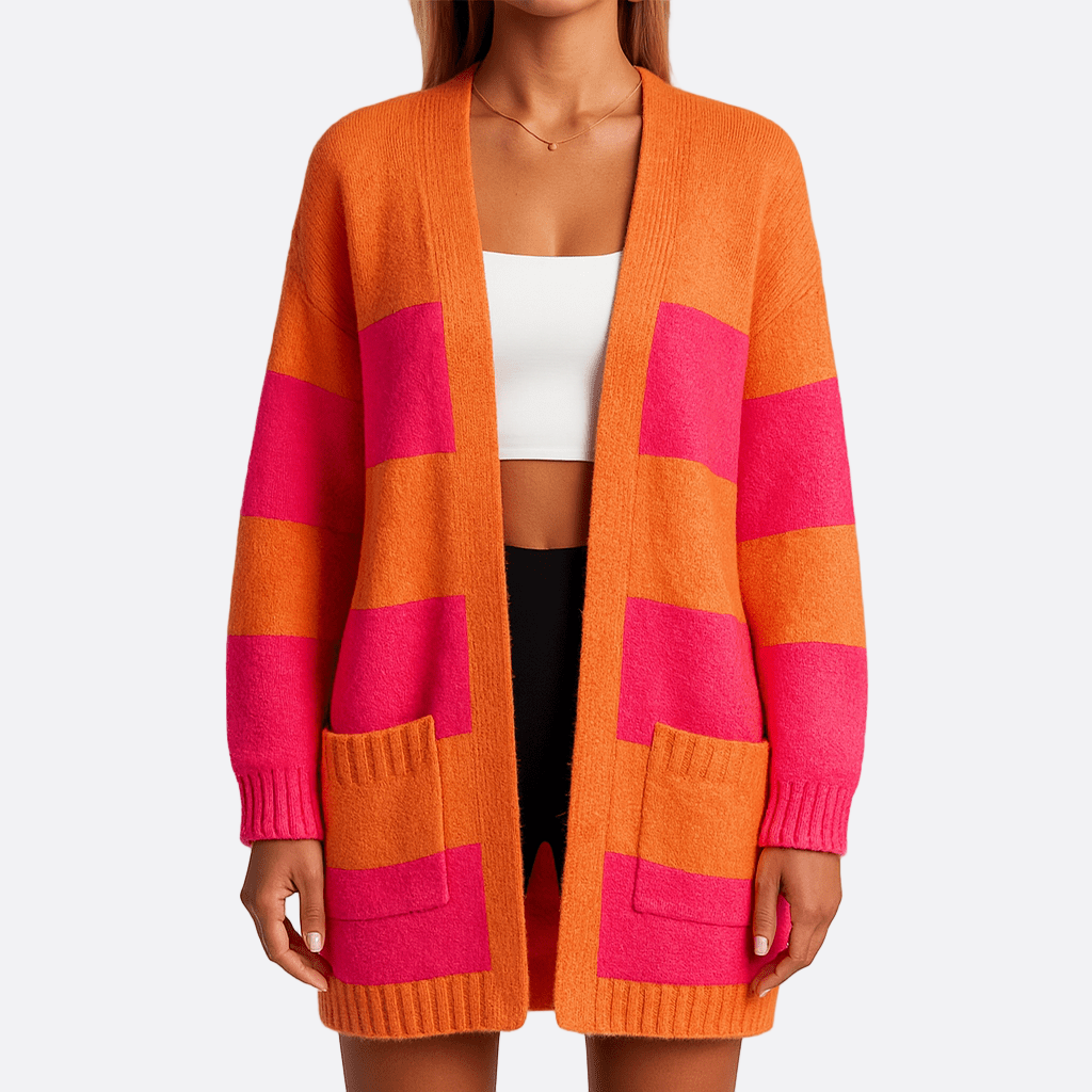 Damska - Płaszcz - Dzianinowy - Stylowy w odważne paski - Modny wybór na każdą okazję