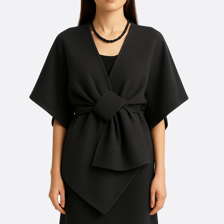 Damska - Płaszcz ponczo - Drapowany wełniany - Wiązaniem w talii - Elegancki styl na każdą okazję
