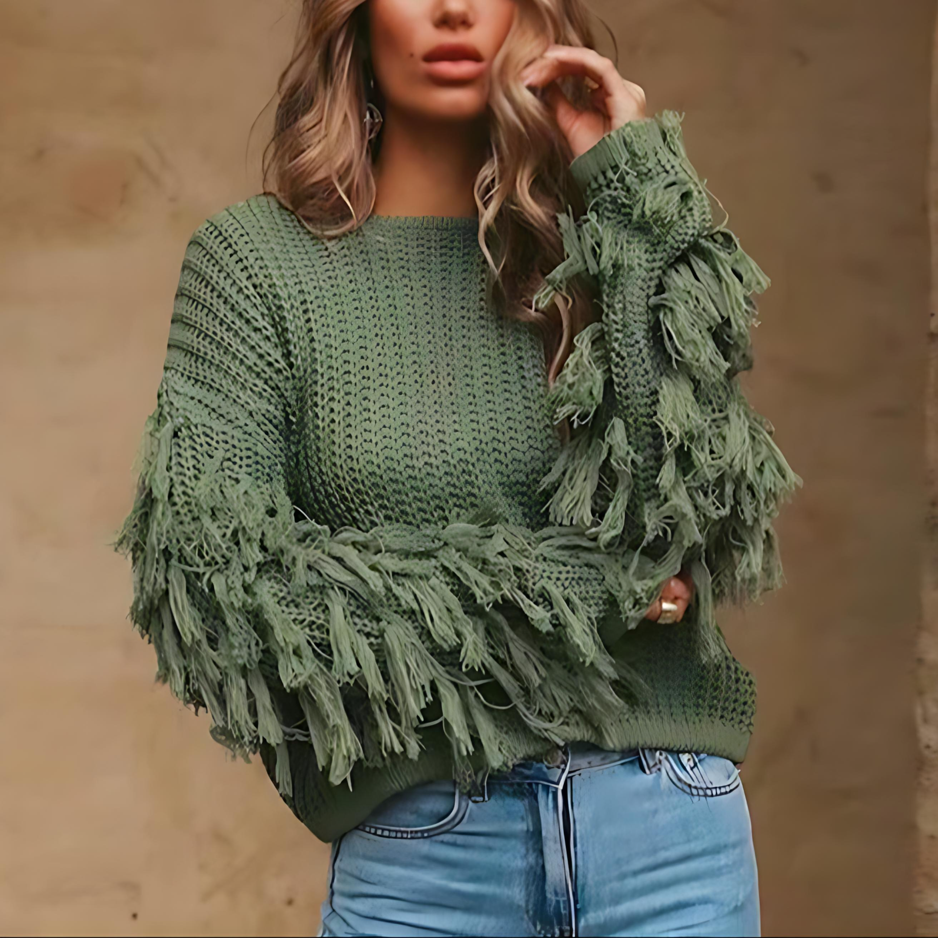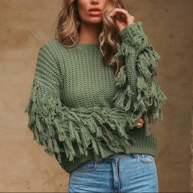 Damska - Przytulny sweter dzianinowy - Rękawy z frędzlami - Modny i komfortowy
