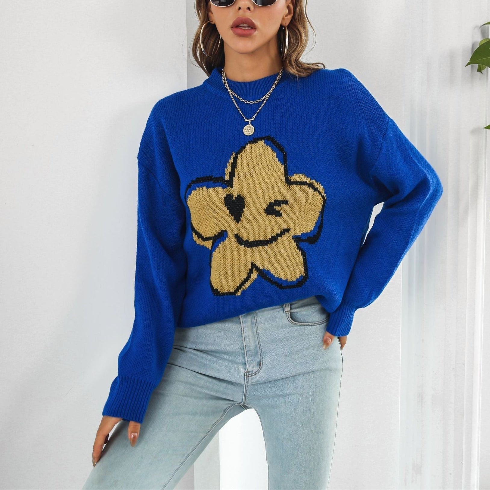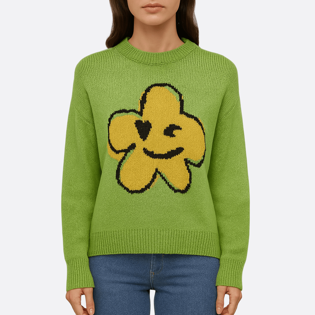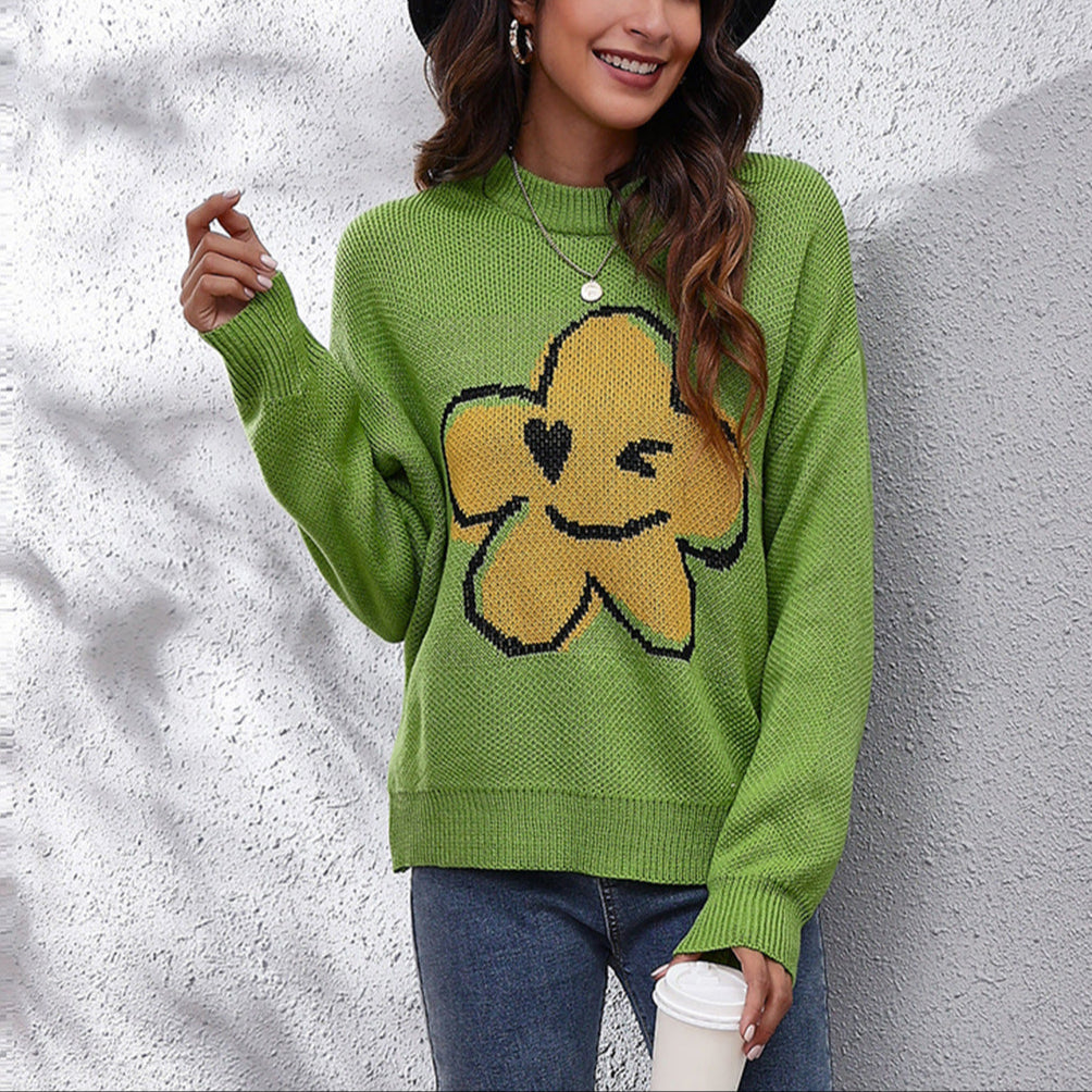 Damska - Sweter - Dzianinowy - Kwiatowy wzór - Modny i wygodny sweter na każdą okazję