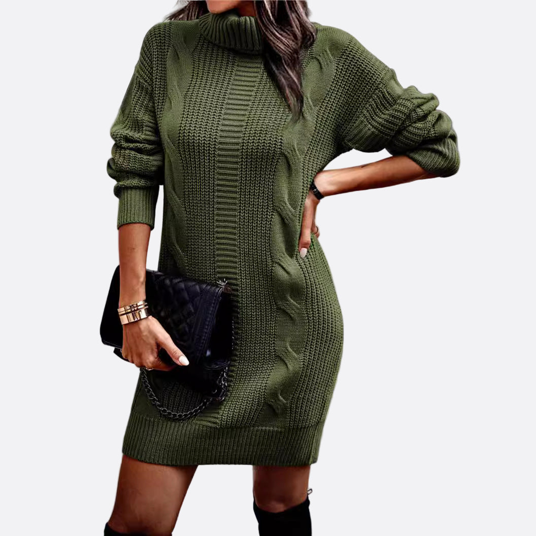 Damska - Szykowna sukienka dzianinowa - Wzór sznurka - Wysoki kołnierzyk - Modny wybór na każdą okazję