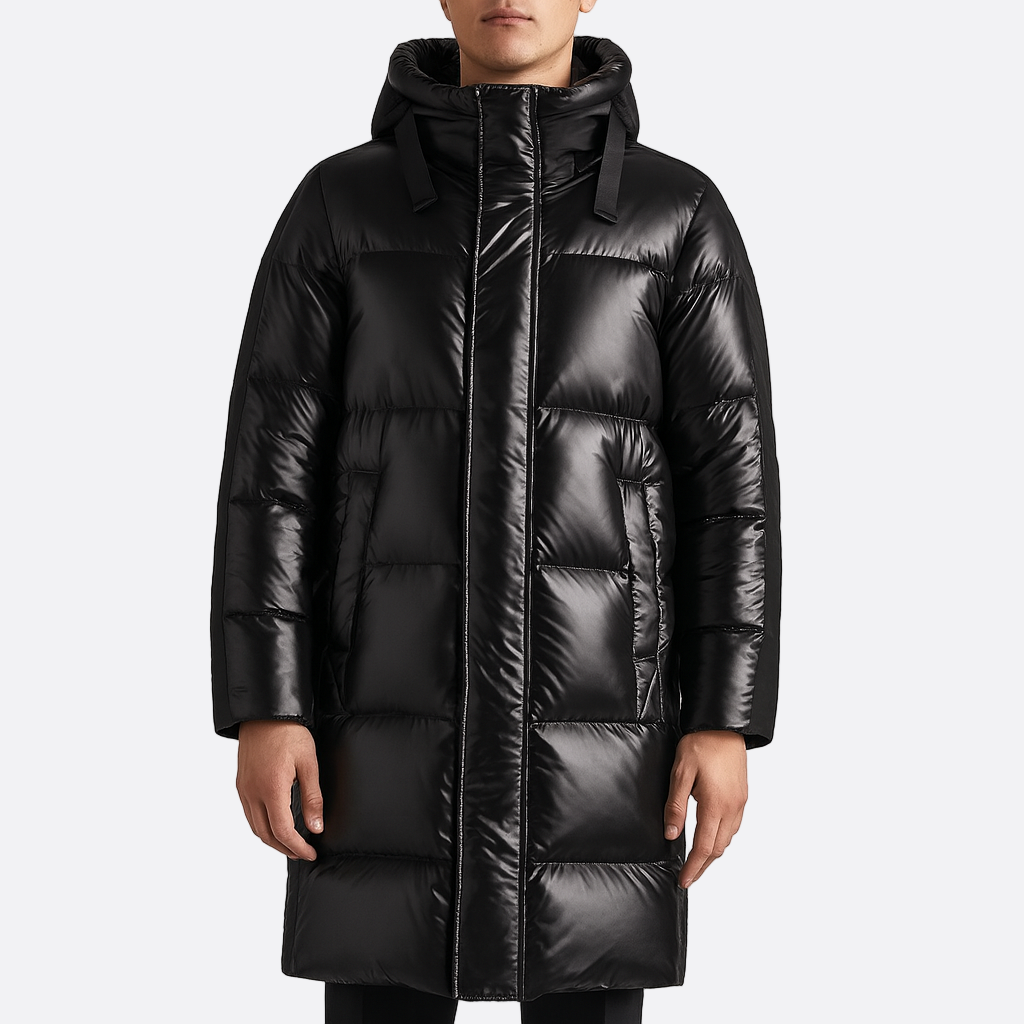 Męska - Długa czarna kurtka zimowa z kapturem - Izolowanych materiałów - Stylowa i ciepła na chłodne dni