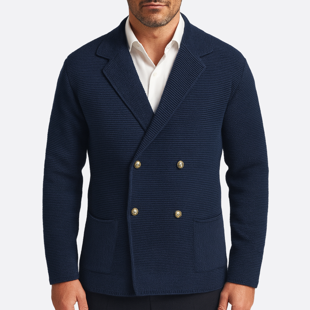 Stylowy męski sweter z dzianiny o nowoczesnym kroju dwurzędowym z klasycznymi klapami, dzięki czemu stanowi uniwersalny wybór do noszenia warstwowego. Teksturowane wykończenie dodaje mu atrakcyjności wizualnej, a zapięcie na guziki z przodu i podwójne kieszenie łączą styl z praktycznością. Idealnie komponuje się ze spodniami, nadając elegancki wygląd, lub z łatwością podkreśla codzienny styl dżinsów. Wzbogać swoją garderobę o ten niezbędny sweter, który łączy w sobie elegancję i wygodę.