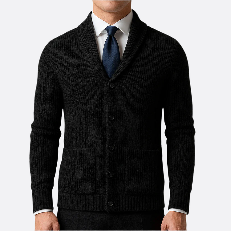 Męska - Kardigan dzianinowy - Szalowym kołnierzem i kieszeniami - Stylowy dodatek na każdą porę roku